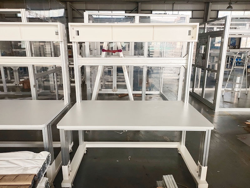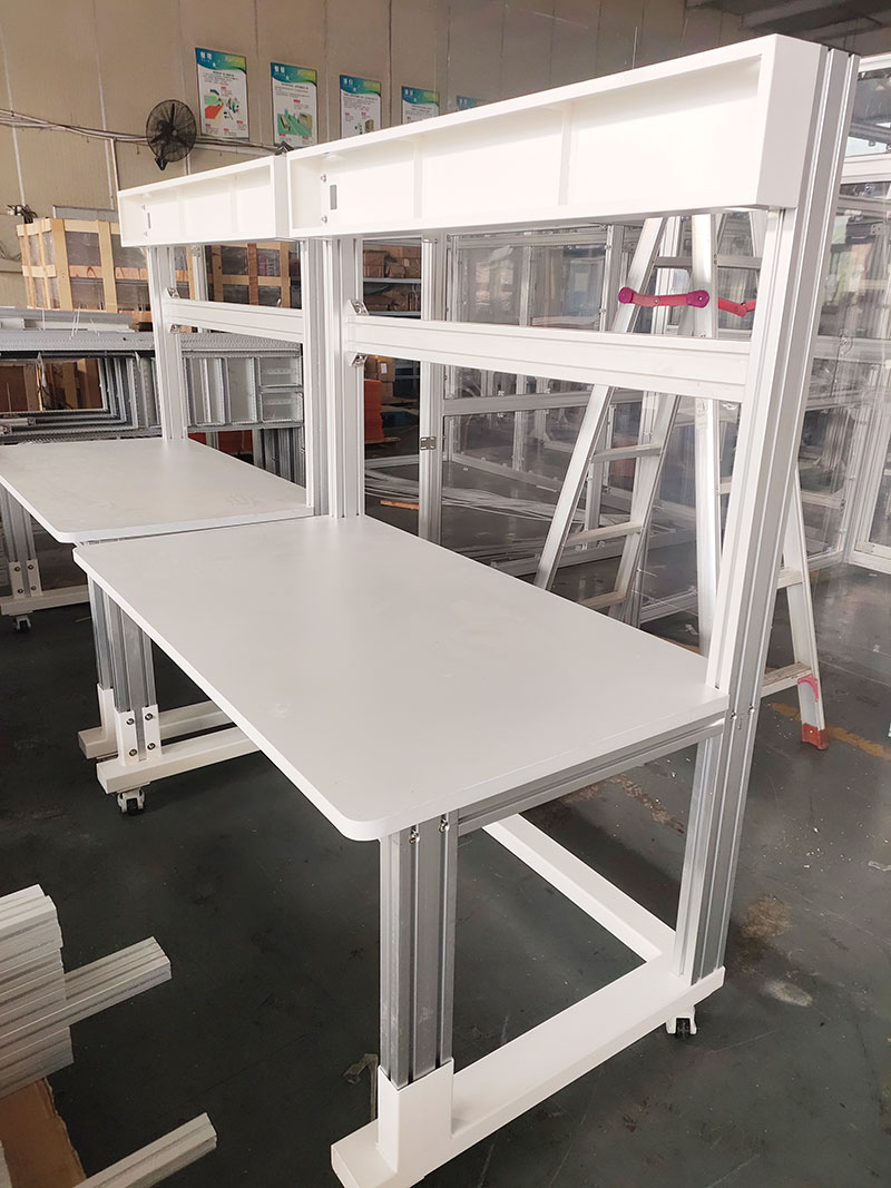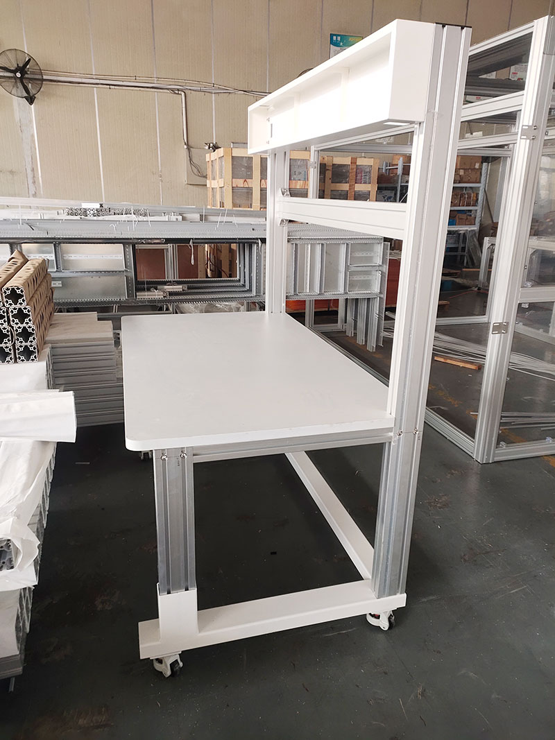 鋁型材工作臺(tái)適合于模具、鉗工、檢測(cè)、維修、組裝等各種不同應(yīng)用場(chǎng)合,具有良好的耐腐蝕性,耐臟性,抗沖擊性和承重性??膳浜喜煌氖褂靡筮x擇不同桌面材質(zhì);所配置的抽屜、柜門(mén)方便使用者存儲(chǔ)工具;桌角上預(yù)留電源孔,方便安裝電源插座。工作臺(tái)(桌)分為輕型(可承重300公斤),中型和重型工作臺(tái)(桌)可承重1000公斤;特制的工作臺(tái)可按需定制??筛鶕?jù)需要靈活地配置各種吊柜、單柜、雙柜等,可加裝掛板,電器板,燈頂板、調(diào)節(jié)腳杯,輪子,擱板等桌上部件,具有多種選擇,能夠滿足各種工位的需求。