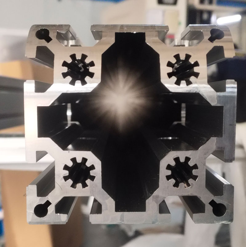 今天給大家介紹大規(guī)格的工業(yè)鋁型材,它就是歐標100乘100鋁型材,利用鋁合金加工性能優(yōu)良的特點,使用模具將圓柱形鋁錠擠壓加工而成。其截面尺寸是100mm乘100mm,整支長度是6.02米,可以根據(jù)需求進行切割。