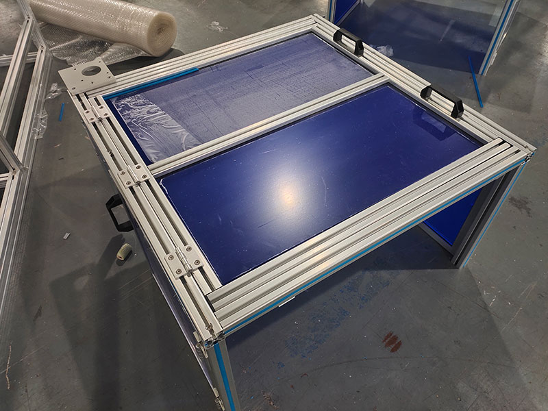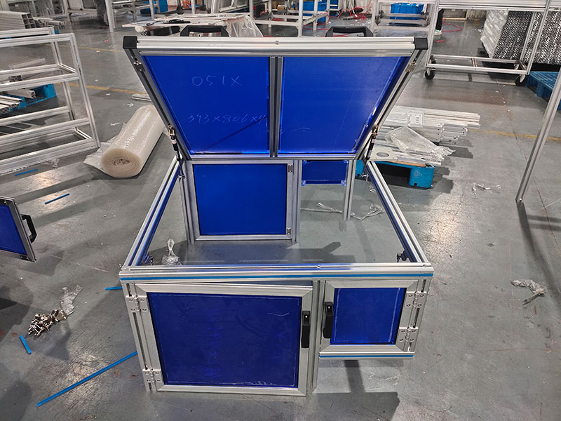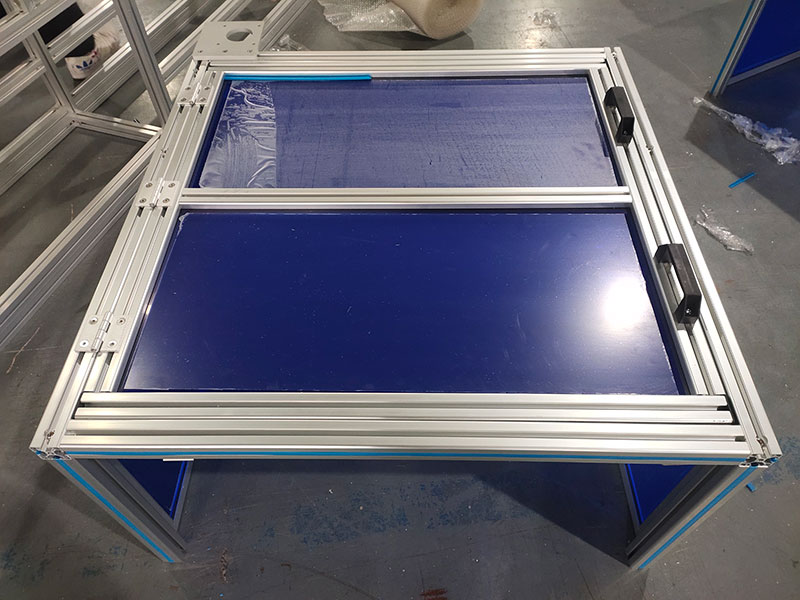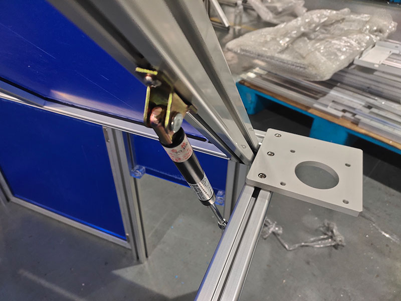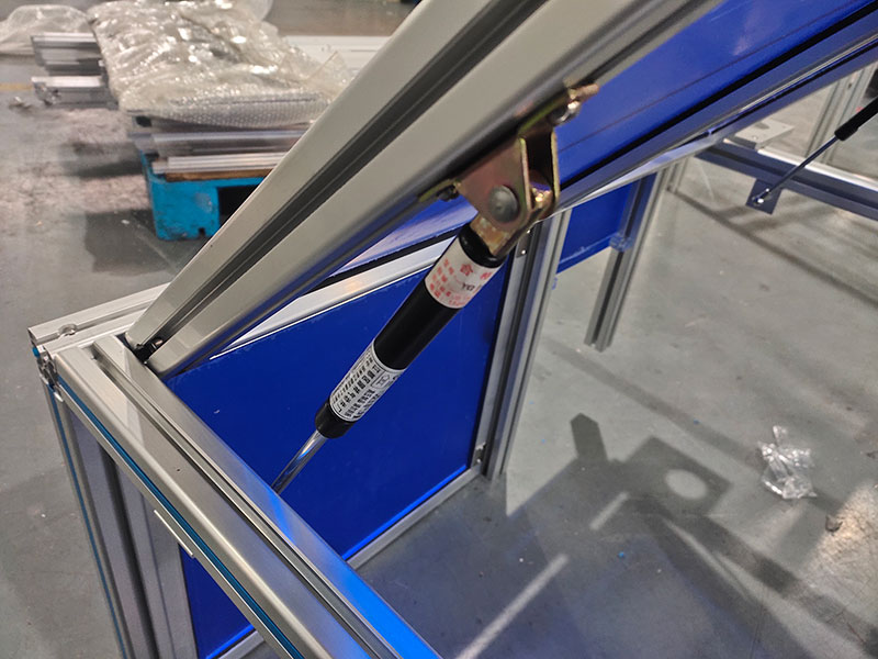 這個鋁型材設備防護罩頂部蓋板可以打開一個角度并固定住,也可以輕輕蓋上。實現(xiàn)這一功能的是蓋板上安裝的氣彈簧。氣彈簧又被稱為支撐桿、氣支撐、調角器、氣壓棒、阻尼器等,是一種可以實現(xiàn)支撐、緩沖、制動、高度及角度調節(jié)等功能的零件,在工程機械中,主要應用于罩蓋、門等部位。